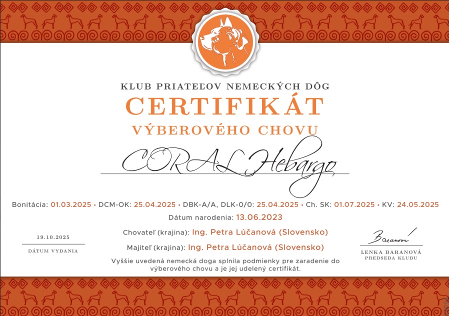 Coralikovi prišiel CERTIFIKÁT VÝBEROVEHO CHOVU za výborné zdravotné a výstavný výsledky.